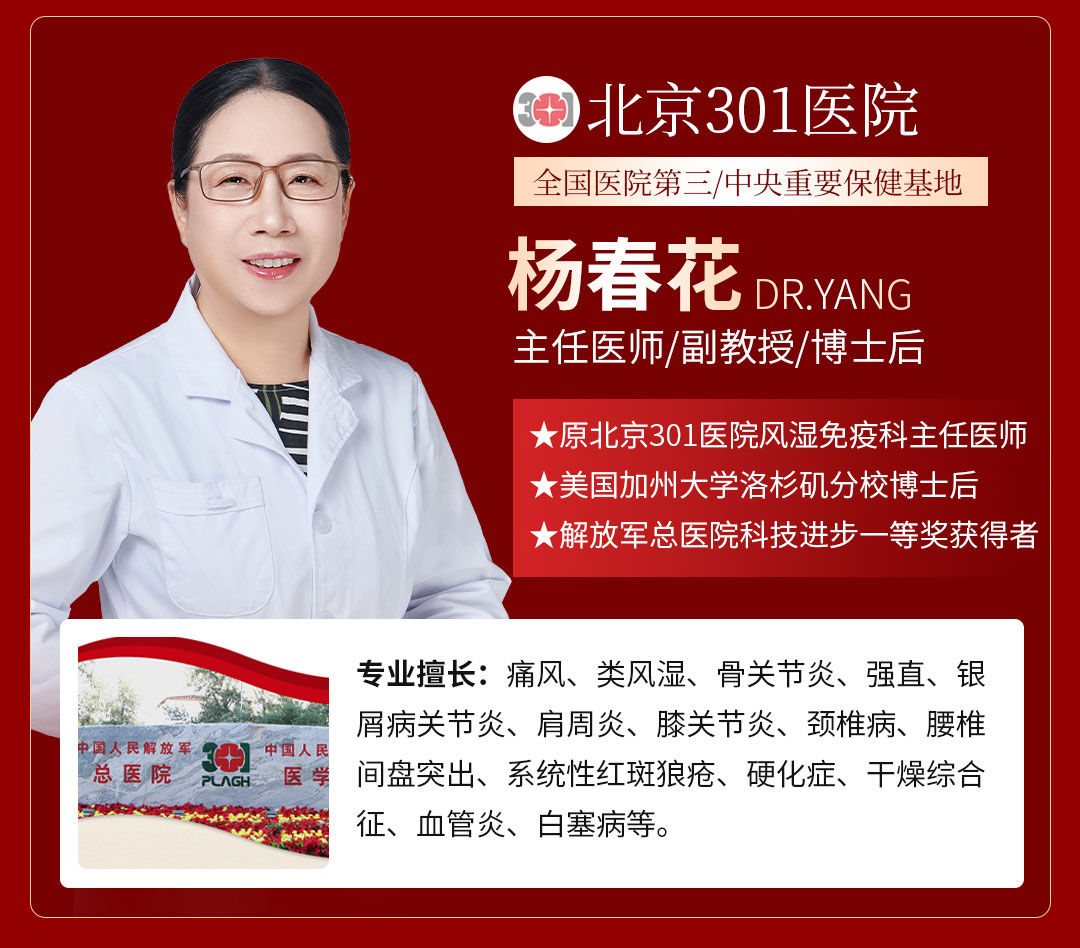 专家介绍:1992年毕业于华中科技大学同济医学院医疗系,在中国人民解放军总医院(301医院)获得医学硕士和医学博士学位、在美国加州大学洛杉矶分校(UCLA)风湿病中心获得博士后。在北京301医院风湿科临床一线工作三十多年,对于各类风湿免疫性疾病具有很好的临床实战经验,同时对一些少见病和疑难病也具有非常丰富的临床经验。