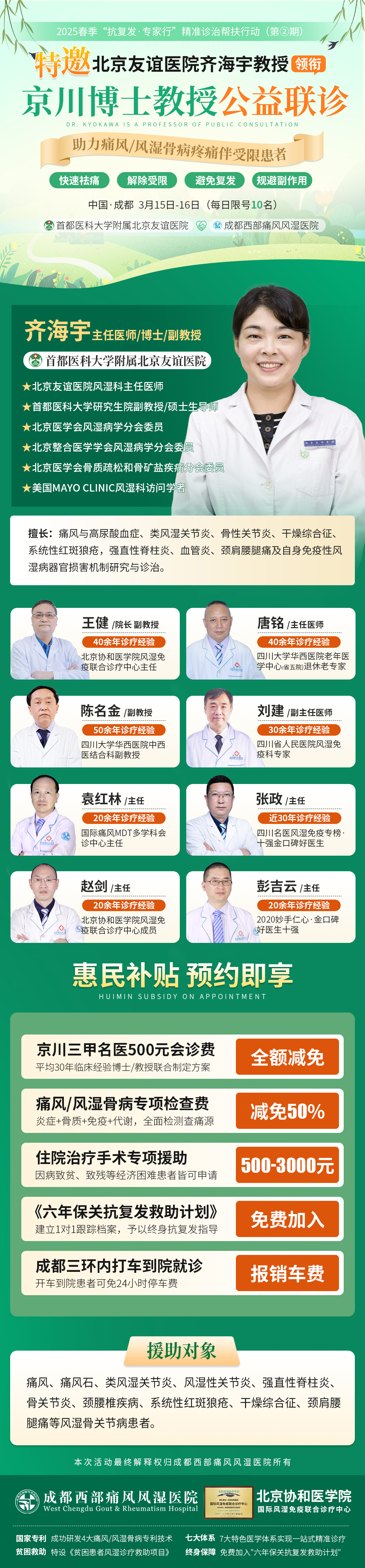 为帮助痛风/风湿骨病患者平稳度过春季高发期,成都西部痛风风湿医院由王健院长率领多学科团队于3月15日-16日特邀北京友谊医院齐海宇教授,联合四川大学华西医院老年医学中心(省五院)退休老专家唐铭主任、四川省人民医院刘建主任、四川大学华西医院陈名金教授共同发起“京川博士教授公益联诊”。