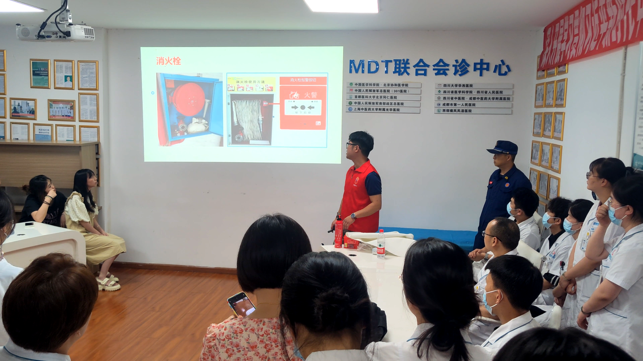 在演练前,消防专业人员在医院二楼MDT多学科会诊中心通过现场讲解与示范,详细传授了演练过程、消防设施的操作、灭火器的使用、消防栓的使用、防护服的穿戴等消防技能及器械使用要点,并对医院特殊环境的火灾风险提供了防控建议。全体员工在现场认真聆听,为此次实战演练打下基础。