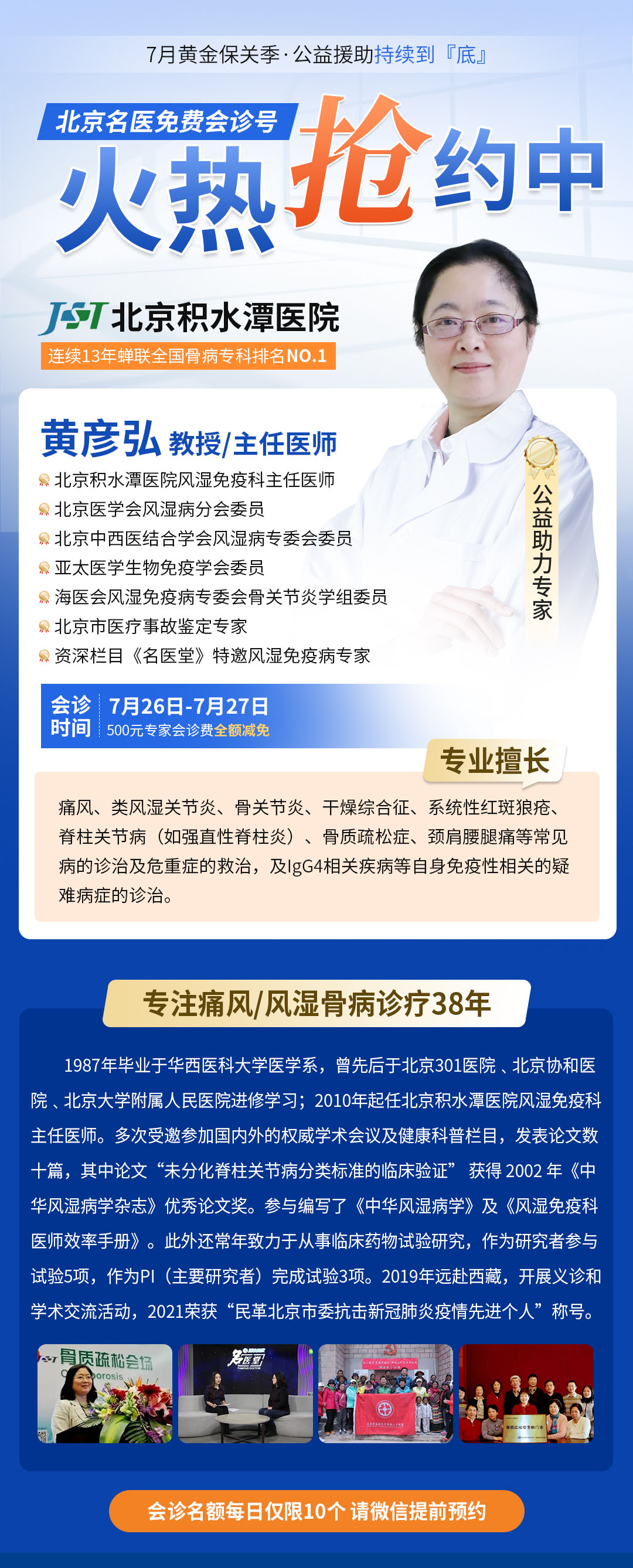 本次公益会诊特邀北京积水潭医院风湿免疫科主任医师黄彦弘教授亲诊,深耕风湿免疫领域30多年,参与制定多项国家诊疗指南,擅长痛风、类风湿、骨关节炎、强直性脊柱炎等疑难风湿骨病的规范化诊疗 ,尤其对难治性痛风石微创清除、风湿骨病精准药物方案制定、关节功能保全与抗复发管理具有丰富临床经验,帮助众多患者实现“祛痛保关”目标。