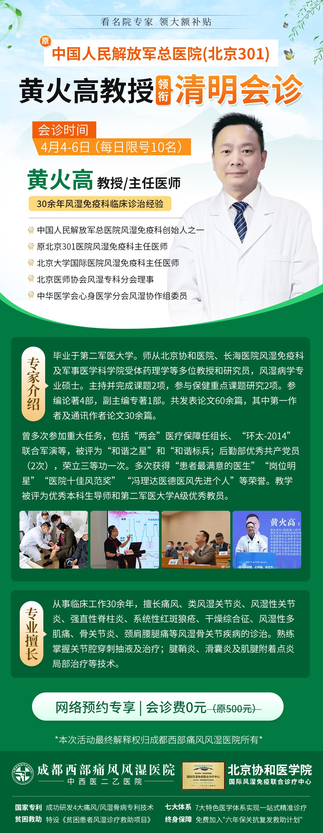 好消息这个清明,为让大家摆脱疼痛,成都西部痛风风湿医院特别开启「京川三甲名医清明专场公益联诊」,原中国人民解放军总医院(北京301医院)风湿免疫科主任医师——黄火高教授领衔会诊,不用跑北京、不用抢号,在家门口就能享受国家级精准诊疗,更有5大公益补贴直击就医痛点,帮你少花钱、看好病!
